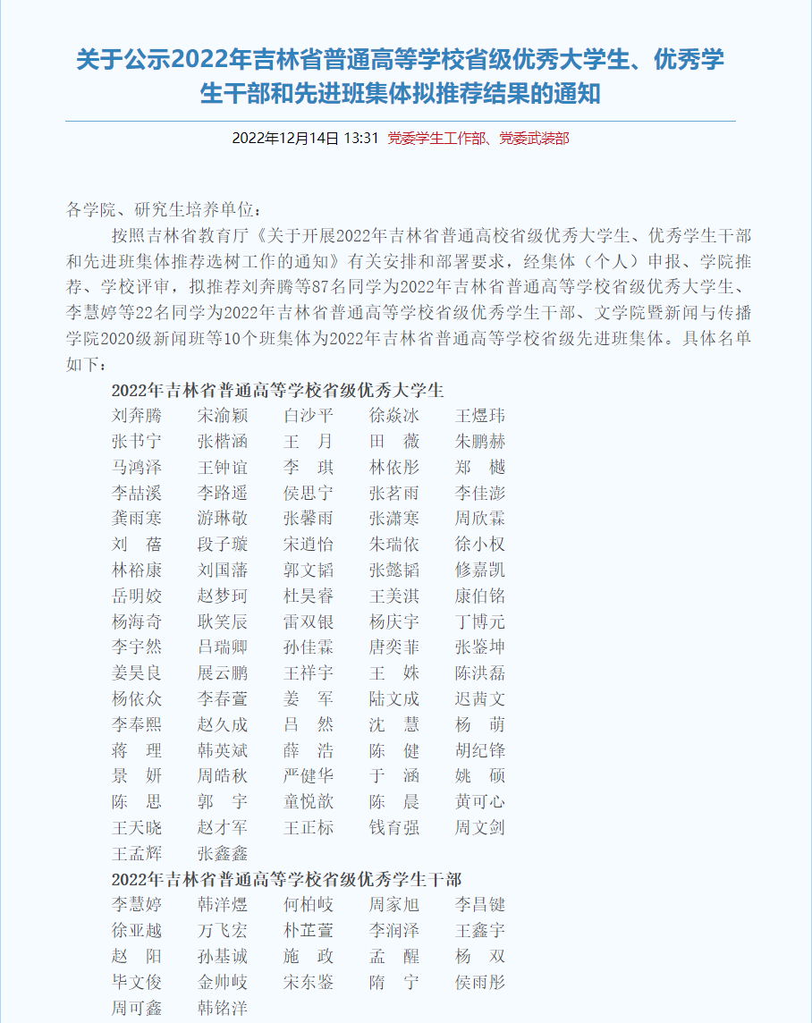 近日,根据吉林省教育厅《关于开展2022年吉林省普通高校省级优秀老员工、优秀员工干部和先进班集体推荐选树工作的通知》有关安排和部署要求,经集体(个人)申报、公司推荐、公司评审,公司2019级社会学专业本科生刘奔腾同学、2020级马克思主义哲学专业博士生姜昊良同学荣获2022年吉林省普通高等公司省级优秀老员工荣誉称号;2020级劳动与社会保障专业本科生李慧婷同学荣获2022年吉林省普通高等公司省级优秀员工干部荣誉称号。