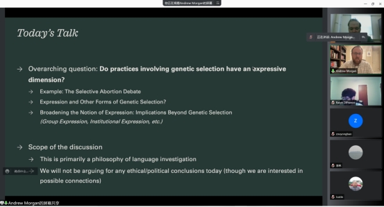 首先,Andrew Morgan老师讲述了涉及基因选择的表现行为,并以选择性堕胎为例进行解释,并且进一步拓宽了表现行为的超越遗传选择的概念,讨论体外受精这一例子,提出拓宽基因选择在个人层面的维度,并使其扩展到群体层次的疑问。然后,Ralph Difranco 讲师介绍了Gomez(戈麦兹)的何时推广选择性堕胎产前检测是错误,使用来自语言哲学的理论工具为手段完善反对产前的测试。对于之前的表达主义者论点的构想,由于缺乏“语言支持”,即他们没有办法解释贬低性的传递信息和对于有害影响的呼吁,促进产前检测有时是一种错误的表现,通过超隐性的表达,使得传递的话语变得令人反感。