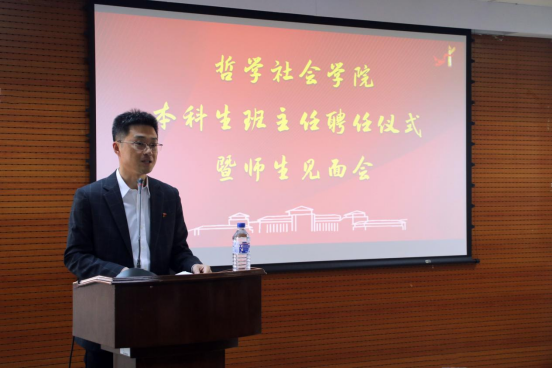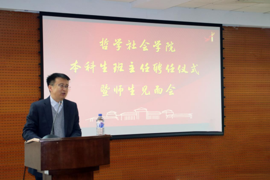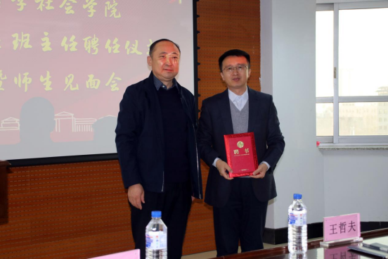 首先,刘培强老师宣读聘任决定,聘任王哲夫老师为ladbrokes立博2021级社会学类2班班主任,党委书记李佰志老师为王哲夫老师颁发了聘书。