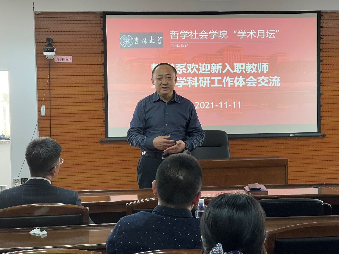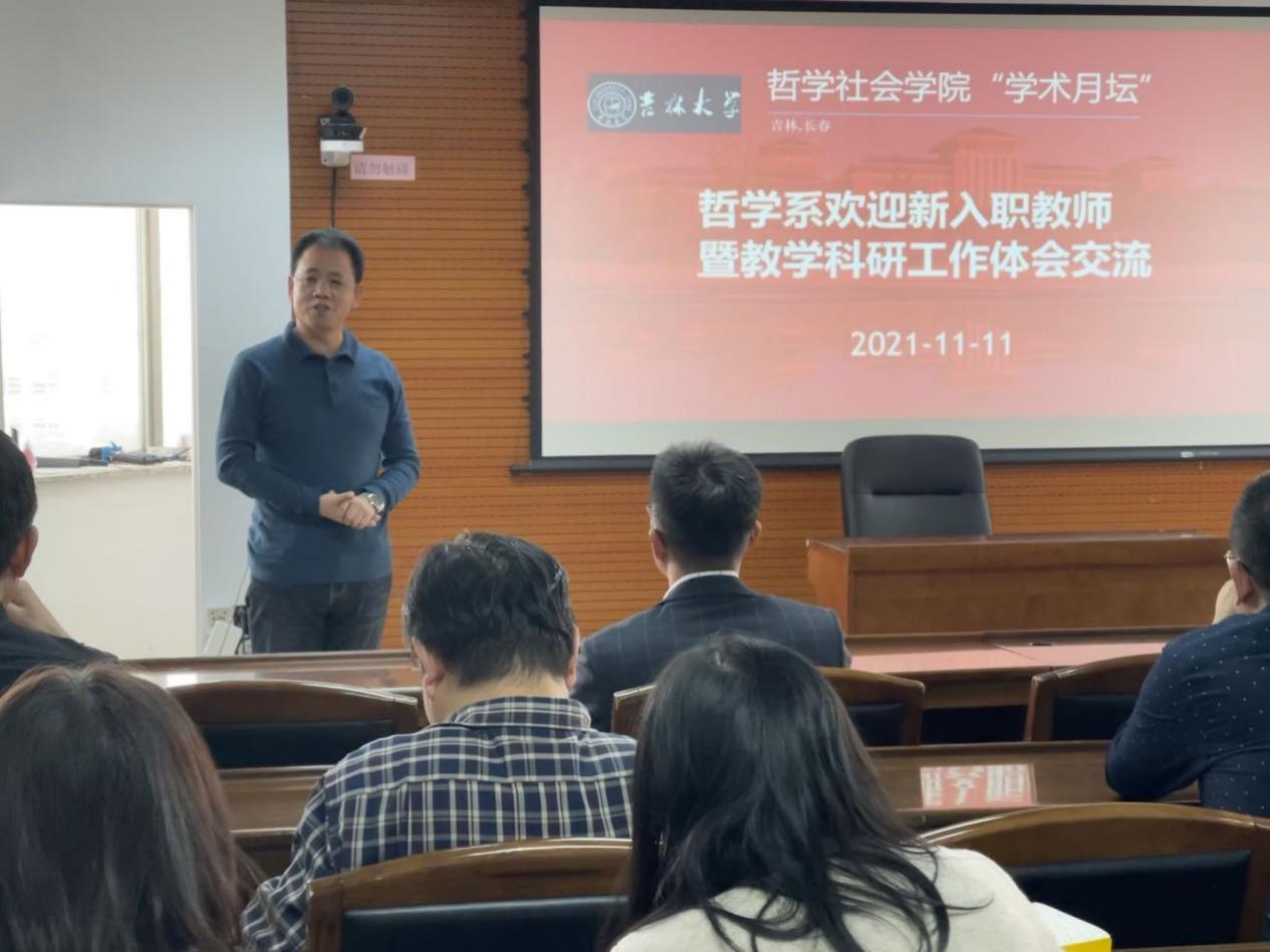 三位新近入职教师,分别介绍了自己的求学和工作经历,讲述了自己学术研究体会。袁立国老师讲述了自己从求学到成为吉大哲学系教师的心路历。在分享研究经验时,袁立国老师表示,确定研究目标需要一段时间的反复琢磨,也建议后来者做学问时不要急于定下目标,哲学需要“找到感觉”。云龙老师高度赞扬吉大哲学研究的水平,吉大哲学系是“真正有哲学的地方”,这是他自己兜兜转转之后回到吉大哲学系的最主要原因。云龙老师结合自己博士后期间的研究,总结说:“无论研究什么方向都一定要不断雕琢自己的学术成果,直至形成体系,这才是做哲学应该有的态度。”郝志昌老师讲述了自己多年以来跨学科求学的经历,讲述了自己从事生命政治研究的体会以及与在座老师从师生关系转为同事关系的奇妙经历。