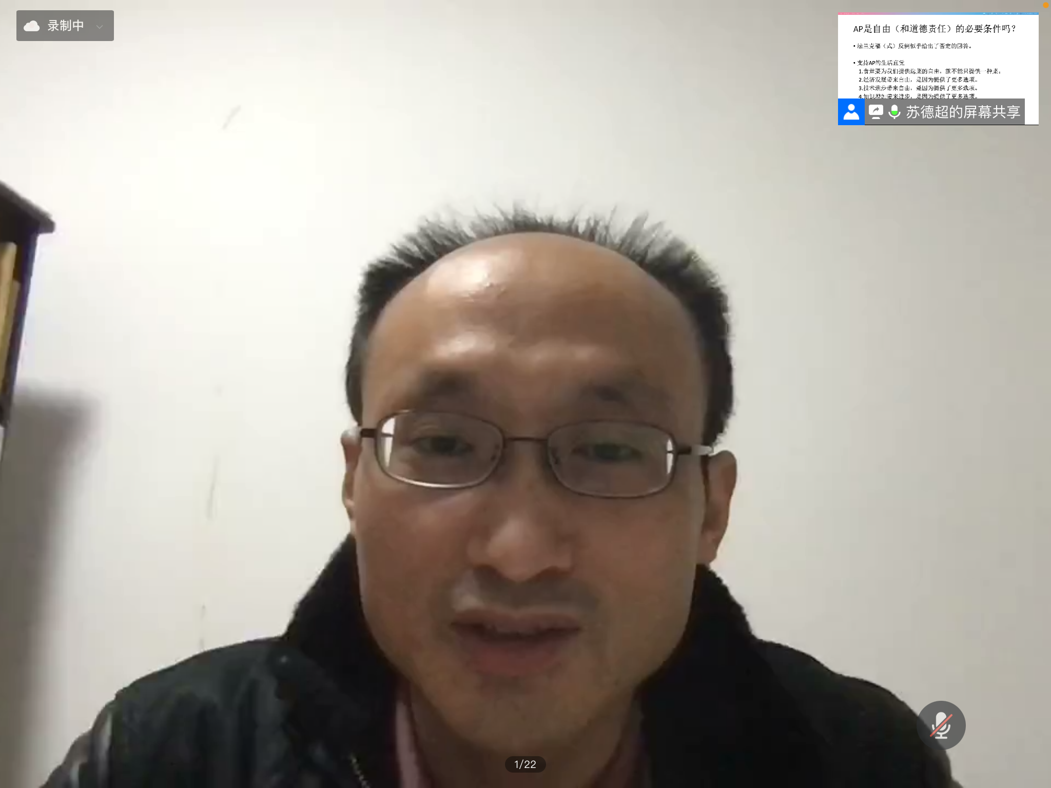 10月17日晚6:30~8:30,武汉大学苏德超教授应邀做ladbrokes立博ladbrokes立博名家系列讲座(第139场),讲座题目为“法兰克福反例——三种自由与道德责任。讲座在腾讯会议平台举行。除ladbrokes立博师生外,来自武汉大学、东北师范大学、黑龙江大学等兄弟院校的众多师生出席。
