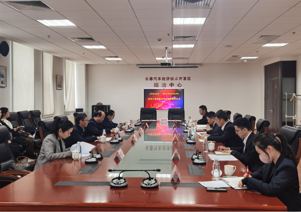 为深入贯彻落实习近平总书记关于民政工作的重要指示批示精神和党的二十大精神,进一步发挥社会工作专业作用,实现社会工作领域理论、人才、资源的共享与互动。经公司与长春汽车经济技术开发区民政局友好协商,联合建立“社会工作研究与实践基地”。2023年4月25日下午13:30,副经理芦恒教授带队与汽开区民政局在汽开区管委会大楼进行政校合作签约揭牌仪式活动。公司参会人员为社会学系副主任张仕平副教授,李晓玲副教授,张竞月副教授。汽开区民政局参会人员为汽开区民政局副局长冯海春、局长助理王东、综合管理科科长朱翰林、社区区划科科长李欣、养老服务科科长张馨元。