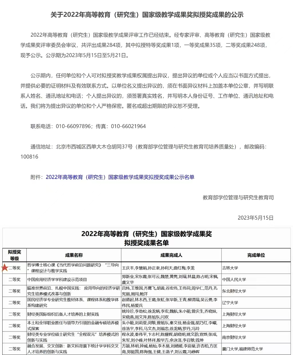 其中,公司王庆丰教授团队的成果哲学博士核心课《当代哲学前沿问题研究》“三导向”课程设计与教学实践获2022年高等教育(研究生)国家级教学成果奖二等奖,让我们表示热烈祝贺!