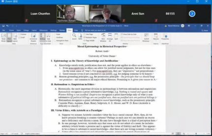 Audi教授从认识论出发,分析了经验主义与理性主义的区别,并进一步地以亚里士多德的美德伦理学、密尔的功利主义、康德的义务论、罗斯的直觉主义以及道德自然主义为理论模块,在历史视角下从整体上宏观地把握道德认识论问题。在Audi教授的讲授中,这五大伦理学理论并非是截然分开的,而是具有批判与继承的关系。因此,Audi教授将在内容上间或有交叉的五大理论进行比较,辨析其异同,并把话题引入“伦理学是否有类似于科学数据的数据”的相关讨论中。