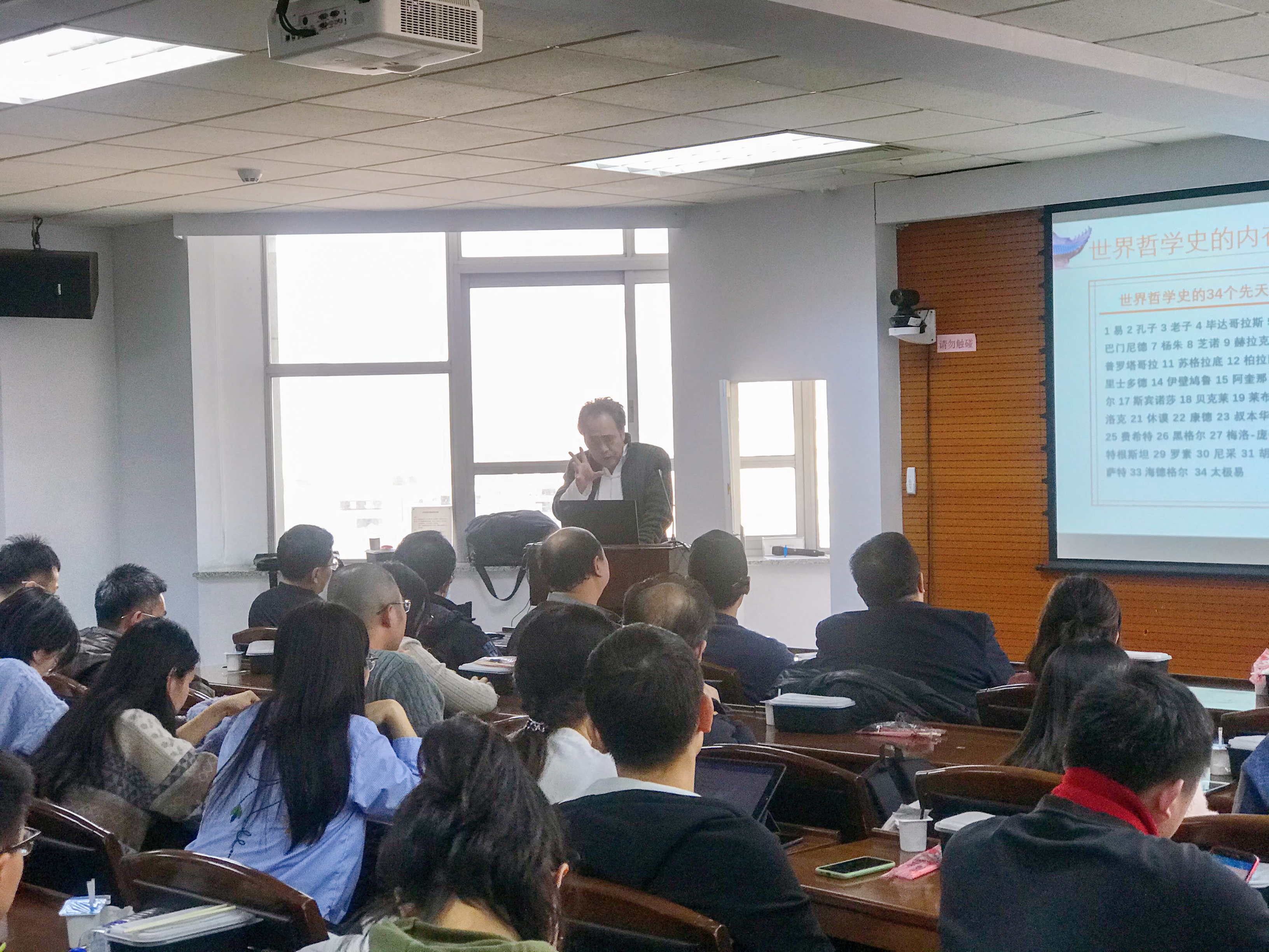 在提问环节,现场的老师、同学与龙老师对许多有趣的问题进行了交流与讨论。最后刘连朋老师简要评价,认为“龙先生所思考的问题出发点是海德格尔与中国哲学,环节是老子的道,这是有学术史依据的”,并对海德格尔哲学与老子思想如何连接的问题表示关注。刘连朋老师充分肯定了龙先生所提出的“宇宙生命”一词对哲学研究的意义,并表示非常钦佩龙先生对中西哲学思想的研究深度和独特的创新思考角度,认为龙先生的《太极之音》在哲学研究领域中具有重大的学术价值,将引发持续的思考。