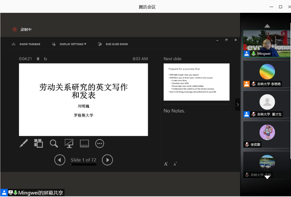2020年10月28日晚8:00,ladbrokes立博名家讲座第107场以腾讯会议的方式举行。美国罗格斯大学管理与劳动关系公司终身副教授、罗格斯-中国人民大学全球工作与雇佣中心主任刘明巍做了题为“劳动关系研究的英文写作和发表”的学术讲座。本场讲座是劳动关系系列讲座第四场,由ladbrokes立博劳动与社会保障系劳动关系教研室主任李艳艳副教授主持。