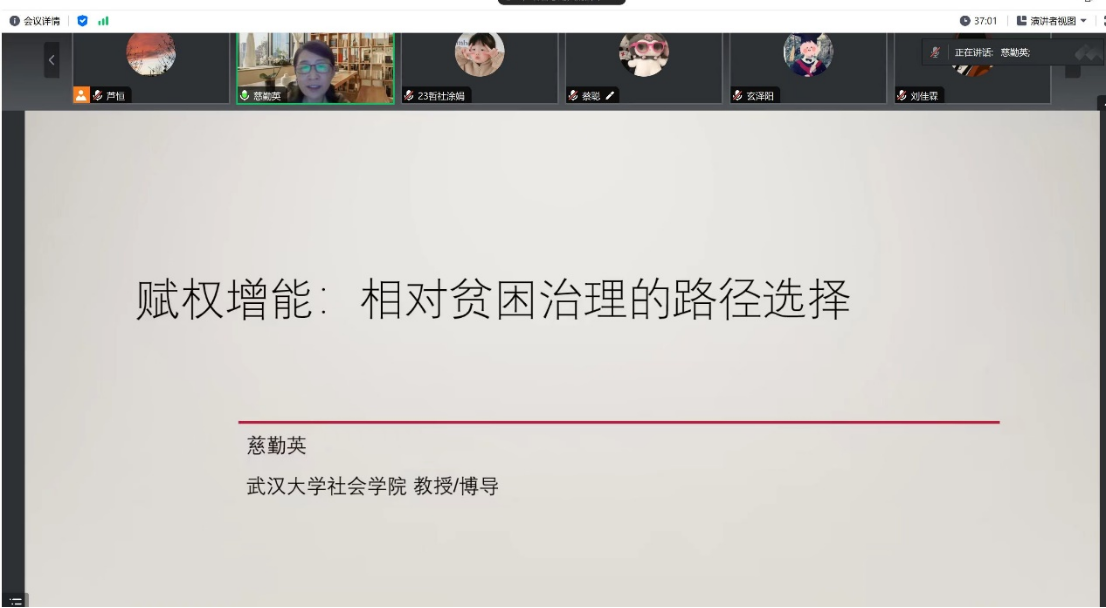 2023年11月4日,公司在线举办ladbrokes立博名家系列讲座第204场,题为《赋权增能:相对贫困治理的路径选择》,主讲人为武汉大学社会公司教授,武汉大学珞珈特聘教授,教育部社会工作硕士专业学位教学指导委员会委员,慈勤英教授。主持人为公司副经理芦恒教授,公司师生百余人参加此次活动。