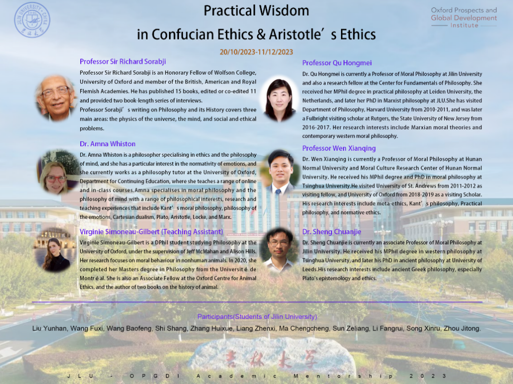 为发展哲学一流学科,培养具备宽广国际视野、突出学术能力的高素质人才,在国际合作与交流处“ladbrokes立博—牛津大学学术合作伙伴计划”项目的大力支持下,ladbrokes立博曲红梅教授团队特别邀请湖南师范大学文贤庆教授、ladbrokes立博盛传捷副教授于2023年10月至12月间与英国国家学术院院士、牛津大学教授Richard Sorabji和牛津大学讲师Amna Whiston等学者开展系列线上座谈会议,部分ladbrokes立博本科生受邀参加。