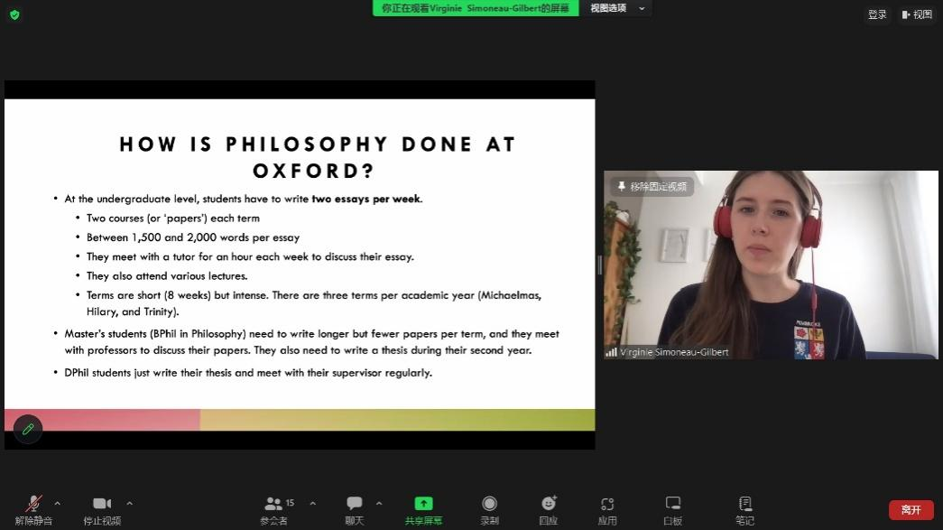 本次项目通过ZOOM平台云端进行,项目主题为“儒家伦理学与亚里士多德伦理学中的实践智慧”。围绕该主题,中外与谈师生分别就“亚里士多德主义及新亚里士多德主义中的实践智慧”、“先秦儒家哲学中的实践智慧”、“新儒家哲学中的实践智慧”、“中外哲学比较”等学术议题展开了九次讨论,历次座谈气氛热烈。最终,与谈双方就“儒家实践智慧与亚氏实践智慧的相似性”、“实践智慧中情感与理性的作用”等诸多层面的学术观点达成共识。