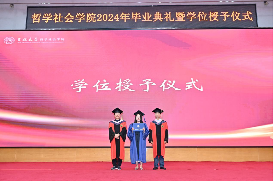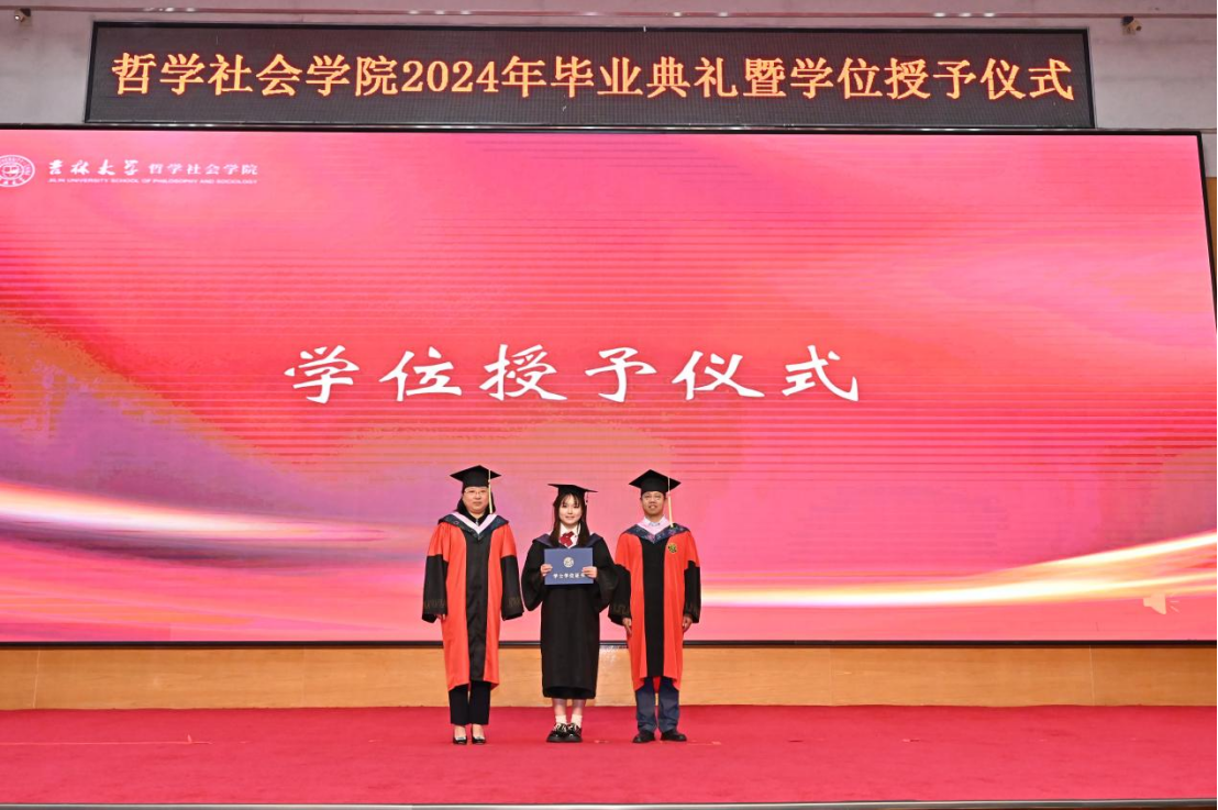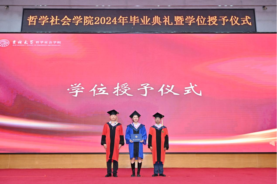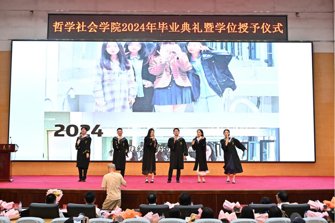 苍梧发轫,毕至昆仑;爱智求真,乘风远航。“为人为学,其道一也”,这是哲社用时光与温柔上的一堂大课,也将是每一位哲社人一生的承诺与践行!未来,也许山高路远,而青春的我们——人比山高,脚比路长。在全体师生热烈的掌声中,2024年毕业典礼暨学位授予仪式圆满落下帷幕!