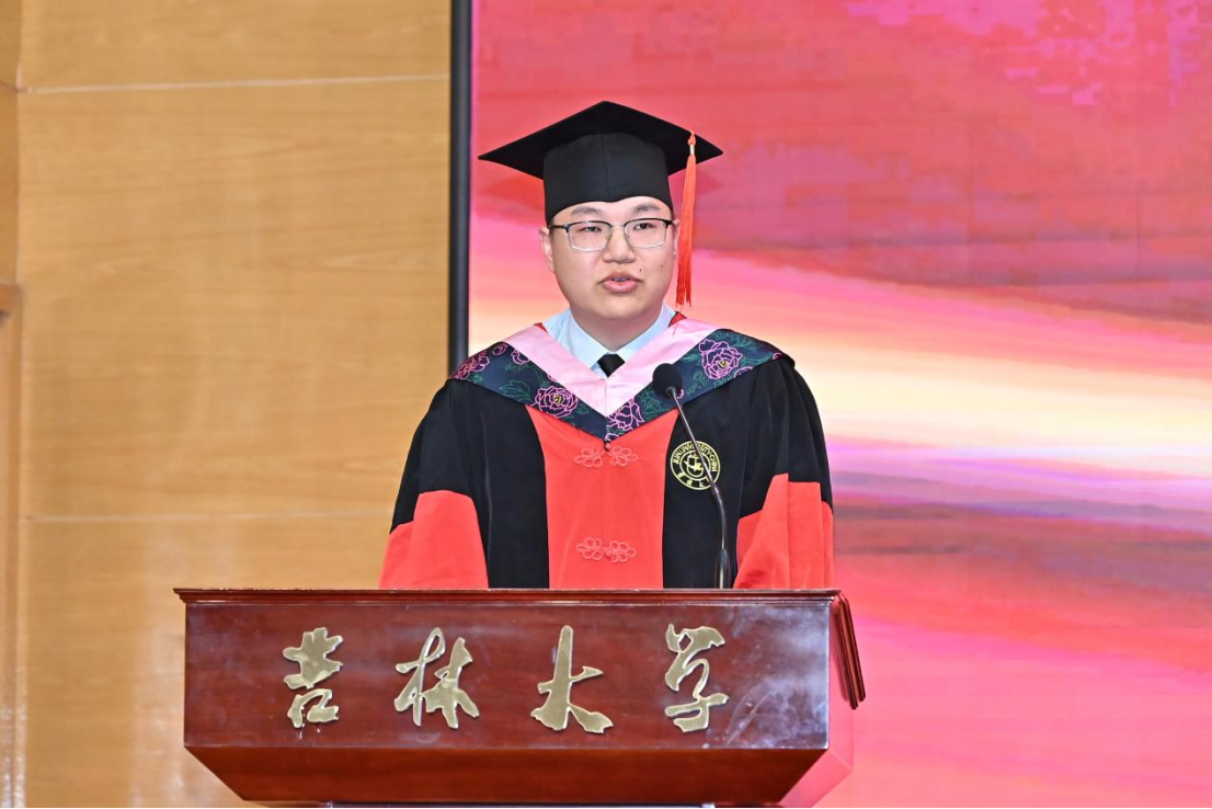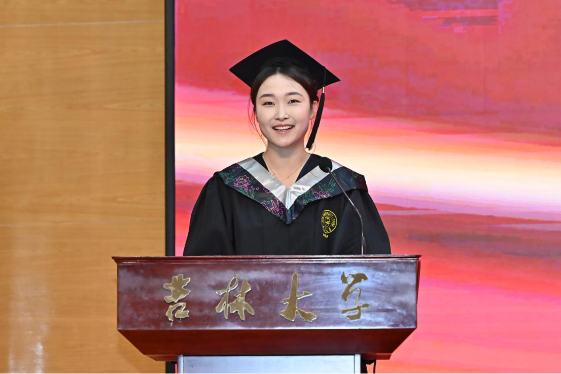 典礼第八项,公司毕业本科生代表,2023年度ladbrokes立博十佳老员工、最美女老员工获得者,2020级劳动与社会保障专业李慧婷发言。她向曾经一路相伴成长、相向奔赴的师长们、亲友们,表达了最真诚的谢意,并回顾了自身沿着初入吉大的旅途一路走来的点点滴滴。她提到,正是公司“为人为学,其道一也”的思想精神、“人比山高,脚比路长”的具体践行浸润了我们的心灵、成就了我们的品格。哲社是每一个你我,哲社成就了我们,我们也共同成为了哲社,无论以后身处何方,愿同学们一起携手努力把“ladbrokes立博的理想”变成“理想的ladbrokes立博”!