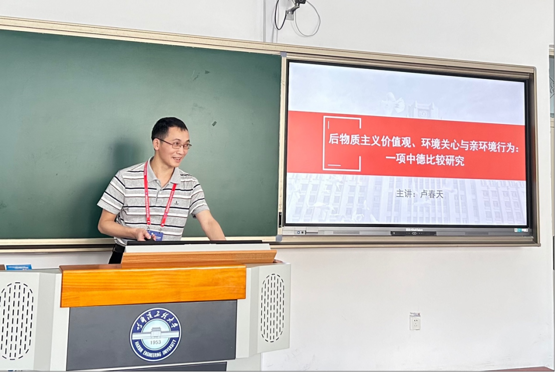 西安交通大学人文社会科学公司社会学系主任卢春天教授作了题为《亲环境行为及其影响机制——一项中德的比较研究》的报告。他从中德两国社会文化环境的差异出发介绍两国亲环境价值观念、态度与行为的差异,以及后物质主义价值观如何通过环境态度影响居民的亲环境行为。研究发现,中国居民倾向于更加温和、保守和私人性质的环保行为,环境态度的中介作用也更加强烈。