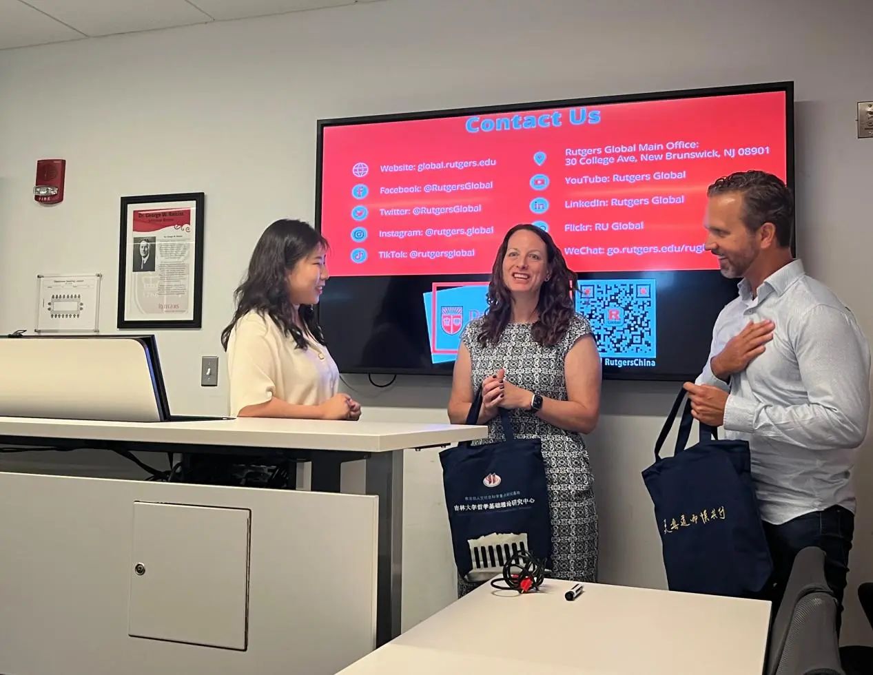 张心耀老师代表公司师生向罗格斯大学的校领导和老师们赠送ladbrokes立博文创纪念品,感谢罗格斯大学对公司师生的热情款待。