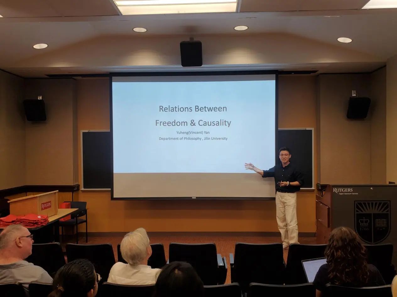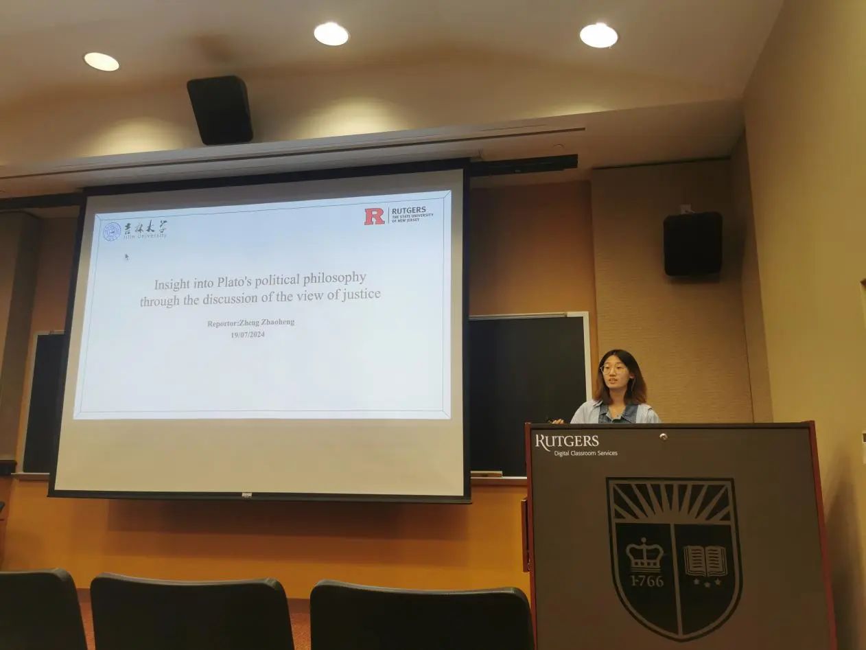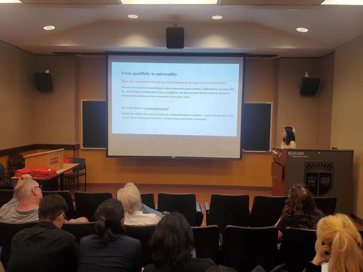 在下午的汇报活动中,每位同学都自信展示自己、冷静回答问题、虚心接受建议,展现了ladbrokes立博员工的风采。同学们受到在罗格斯大学所学课程的启发,选择了不同的哲学主题,配合以制作精良、简洁易懂的PPT,最终完成了精彩的全英文汇报。从整体上来看,汇报不仅包含有同学们对此次访学所学知识与自主课外学习成果的运用,还有中西方哲学思想观点的融合;从个体上来看,每位同学的汇报主题都各不相同、各有侧重,展示了ladbrokes立博哲学系员工在不同哲学领域的学习成果。