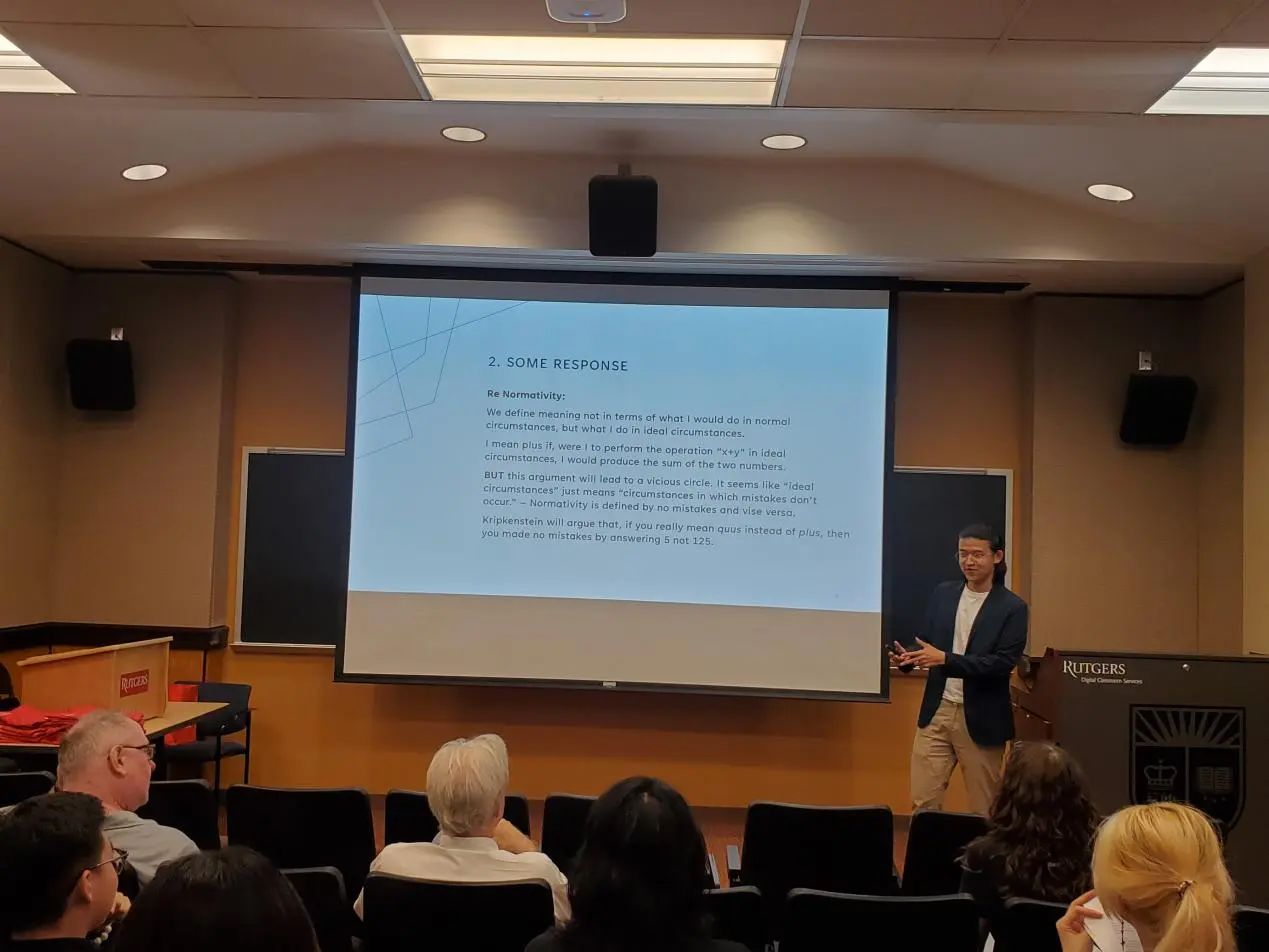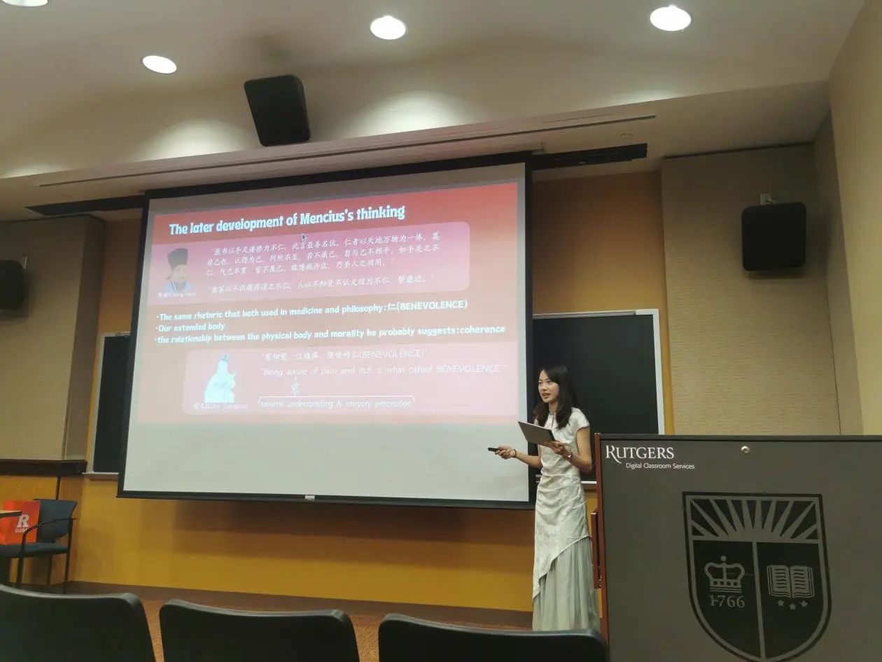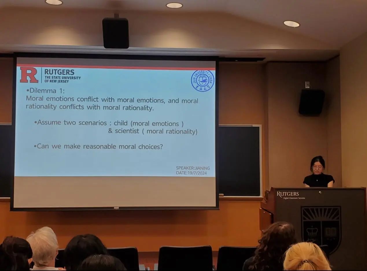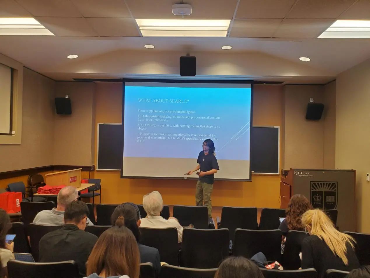 在下午的汇报活动中,每位同学都自信展示自己、冷静回答问题、虚心接受建议,展现了ladbrokes立博员工的风采。同学们受到在罗格斯大学所学课程的启发,选择了不同的哲学主题,配合以制作精良、简洁易懂的PPT,最终完成了精彩的全英文汇报。从整体上来看,汇报不仅包含有同学们对此次访学所学知识与自主课外学习成果的运用,还有中西方哲学思想观点的融合;从个体上来看,每位同学的汇报主题都各不相同、各有侧重,展示了ladbrokes立博哲学系员工在不同哲学领域的学习成果。