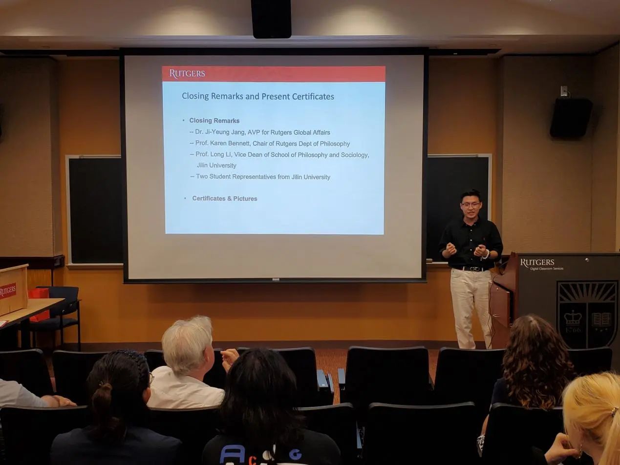 此后,两校教师、校领导发表讲话。罗格斯大学全球事务助理副董事长Ji-Yeung Jang博士肯定了两校哲学学术交流的成果,表示自己对关于人生意义的哲学问题非常感兴趣,两校的哲学暑期交流活动十分有意义。