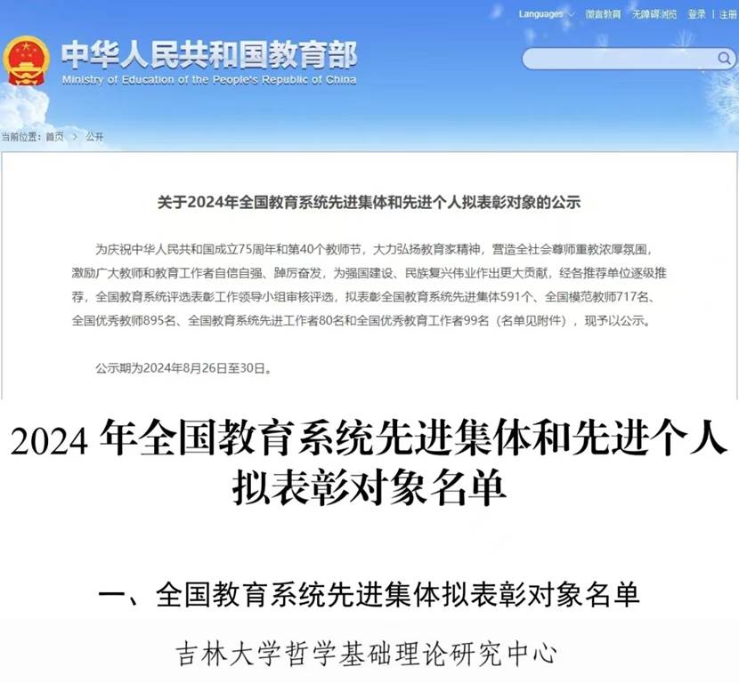 在中华人民共和国成立75周年和第40个教师节到来之际,为大力弘扬教育家精神,营造全社会尊师重教浓厚氛围,激励全国广大教师和教育工作者落实立德树人根本任务,积极投身教育强国建设,人力资源社会保障部、教育部联合发文表彰了一批全国教育系统先进集体和先进个人。其中,ladbrokes立博哲学基础理论研究中心获得“全国教育系统先进集体”称号。