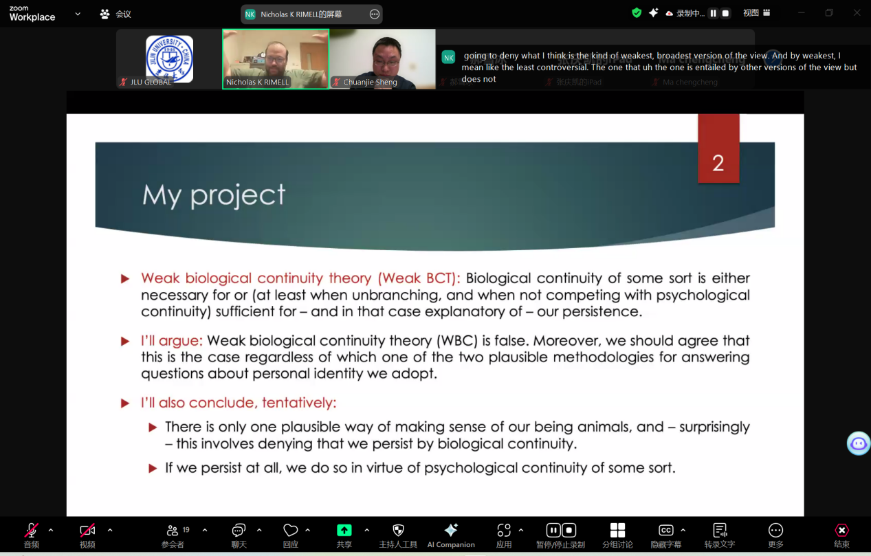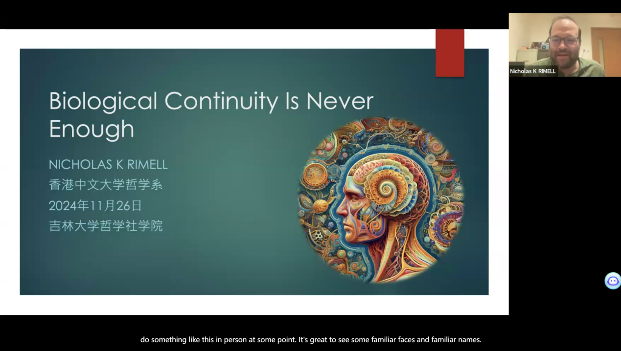 2024年11月27日晚6时30分,ladbrokes立博“国际合作平台学术讲座”第48讲——“Biological Continuity Accounts of Personal Identity”(生物连续性视角下的个人身份)在线上成功举办。香港中文大学助理教授Nicholas Rimell担任本次讲座主讲嘉宾,公司盛传捷副教授担任主持人。