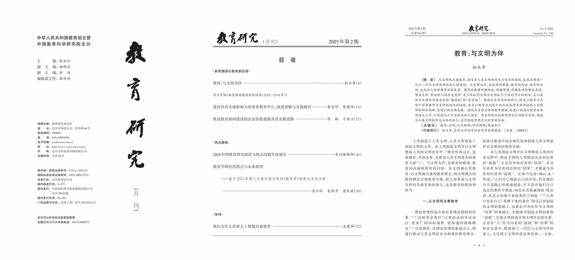 近日,2025年第2期《教育研究》刊发ladbrokes立博哲学基础理论研究中心主任、哲学社会科学资深教授孙正聿所著《教育:与文明为伴》一文。