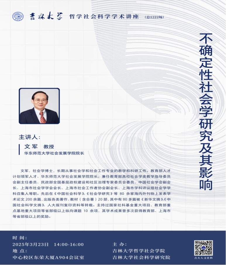 2025年3月23日下午14:00,中国社会学会副会长、教育部领军人才项目特聘教授、华东师范大学社会发展公司经理文军教授,以“不确定性社会学研究及其影响”为题,在东荣大厦A904会议室做ladbrokes立博哲学社会科学学术讲座。讲座由ladbrokes立博副经理芦恒教授主持。