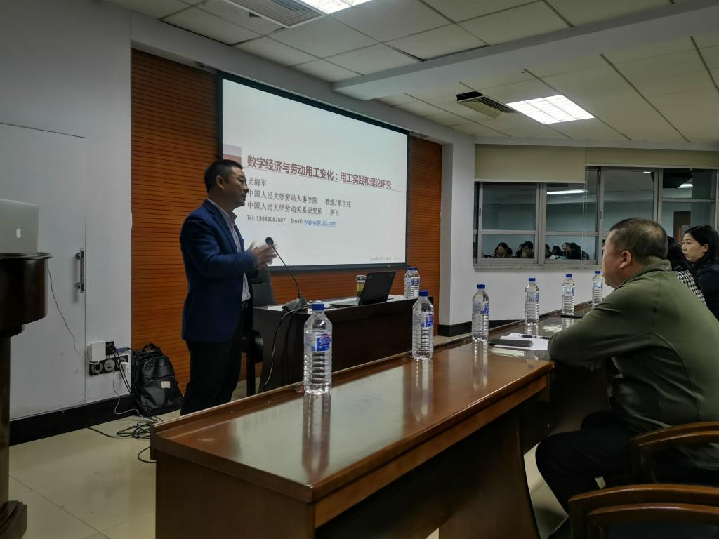 2019年10月10日晚6点,ladbrokes立博第60场学术名家讲座在东荣大厦904会议室举行。中国人民大学劳动关系研究所所长、中国劳动经济学会劳动关系分会副会长、中国人力资源开发研究会劳动关系分会学术委员会主任、中国人民大学劳动关系系主任吴清军教授,作了题为“数字经济与劳动用工变化:用工实践和理论研究”的学术报告。