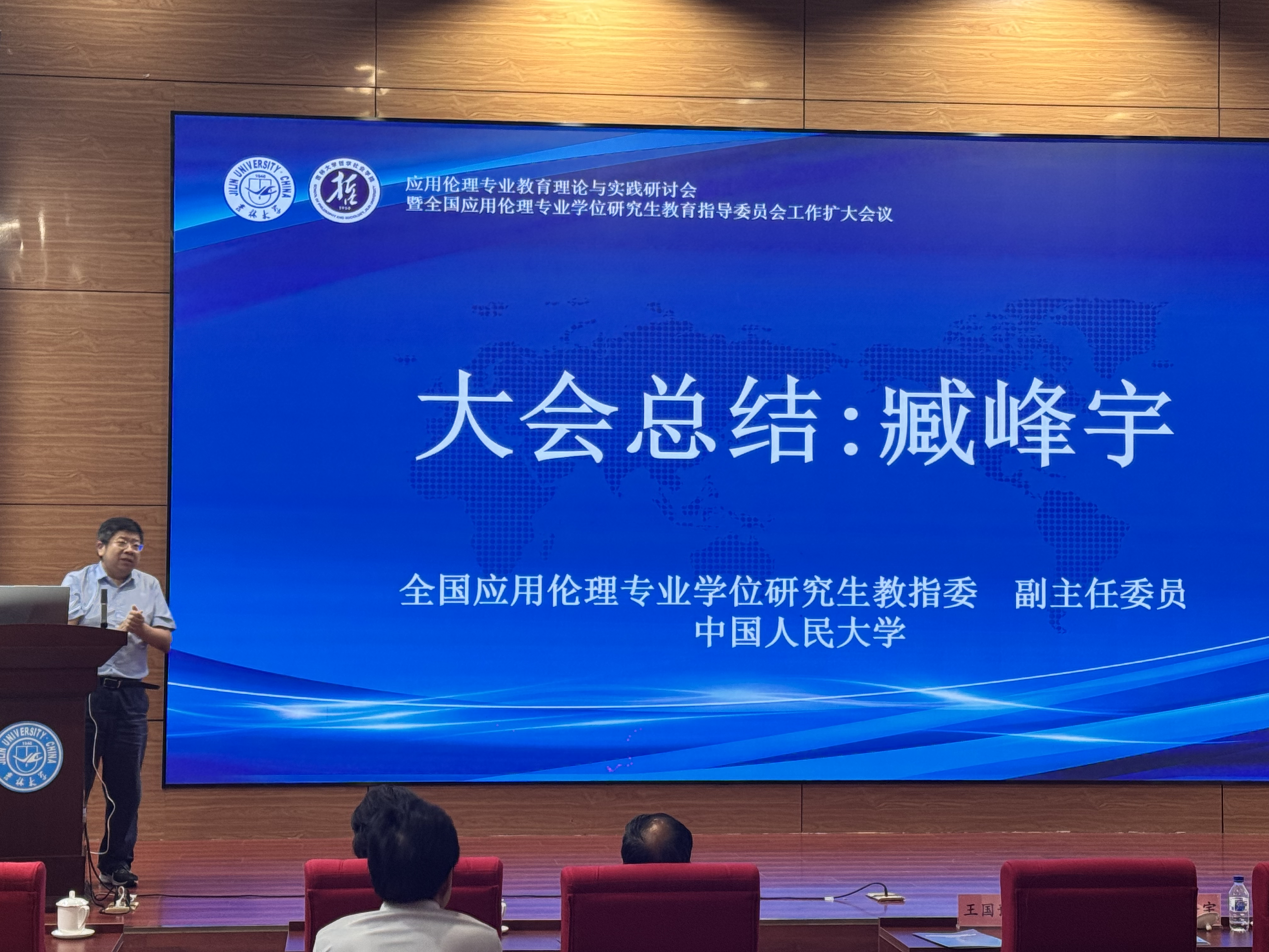 全国应用伦理专业学位研究生教指委副主任委员、中国人民大学臧峰宇教授对会议做了总结。臧峰宇教授表明大会涉及到的内容极其丰富,但大家都更加关注科技伦理、生命医学伦理、人工智能伦理。臧峰宇教授认为,哲学对人类现实生活极其重要。哲学要尝试与别的学科融合,增强哲学解决现实问题的能力,从而将应用伦理专业发展地更好。会议最后,全国应用伦理专业学位研究生教指委秘书长、复旦大学杨庆峰教授宣布,本次“应用伦理专业教育理论与实践研讨会暨全国应用伦理专业学位研究生教育指导委员会工作扩大会议”圆满闭幕!