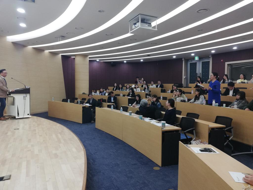 5月7日上午,交流团来到了首尔外籍流动女性咨询中心,听取金泰姬主任的报告。金主任介绍了中心的基本结构,并对包括家庭暴力、家庭矛盾、夫妻矛盾、性暴力等问题传授了专业服务的经验。交流团就韩国社会的基本福利保障服务、家庭服务、社工服务等问题与金主任进行了热烈的探讨。5月7日下午,交流团来到了成均馆大学的儒学公司,听取朴素晶教授的学术讲座。朴素晶副教授梳理了韩国哲学在东亚的发展脉络,通过对《三国遗史》中檀君神话的阐释,分析了韩国哲学的自我认同问题。