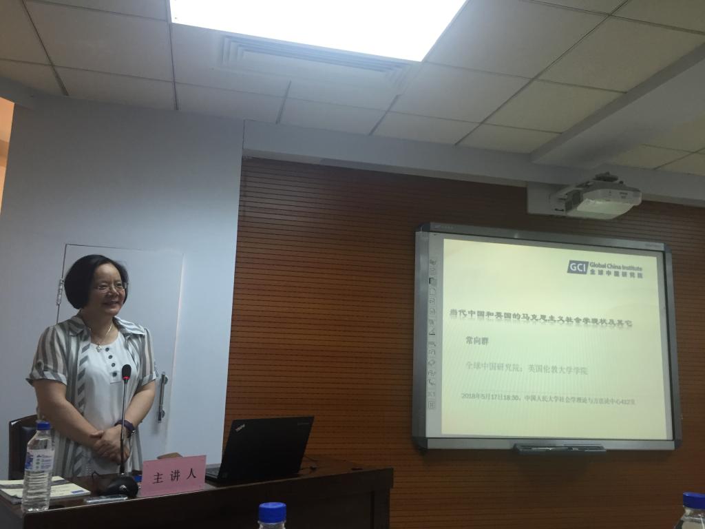 常向群教授首先从中国马克思主义社会学研究丛书、发表专注、译著学术论文及研究项目等多个方面具体状况及论文数据指标出发,对近年来中国马克思主义社会学研究趋势进行分析和总结,指出虽然目前马克思主义社会学的相关活动及论文呈现出逐年增长的良好势头,从研究中提炼中国特色的马克思主义社会学的概念、理论和方法,形成马克思主义社会学的中国学派指日可待。其后,常向群教授从为什么要打造全球话语平台、怎样理解中国话语、如何打造全球话语阵地等方面进行阐述。她指出,随着“全球社会”的来临及中国国际地位的日益提升,中国有能力也有义务加入到“全球治理”的队伍中并发挥积极角色。打造全球华语阵地是手段、提升中华学术话语是短期目的、贡献于人类的知识体系是长远目标,二者相结合参与全球社会的社会建设和全球社会的综合治理、共建人类命运共同体。值得注意的是,提升中华学术话语的前提是理解中国社会和中国人。常向群教授通基于对费孝通先生《江村经济》的研究,根据不同时代背景,村民、乡镇、国家主体间关系的动态转化过程,对中国“礼尚往来”的概念及其运作机理进行探寻和概括,将中国社会总结为一个以表达性往来为主体的多种关系类型并存的、非所谓“关系社会”。此外,常向群教授还以“全球中国研究院”的建构及其组织体系为例,向与会师生详细介绍了中国打造全球话语阵地、将人类知识大厦中加入中国的元素的有效实现路径。