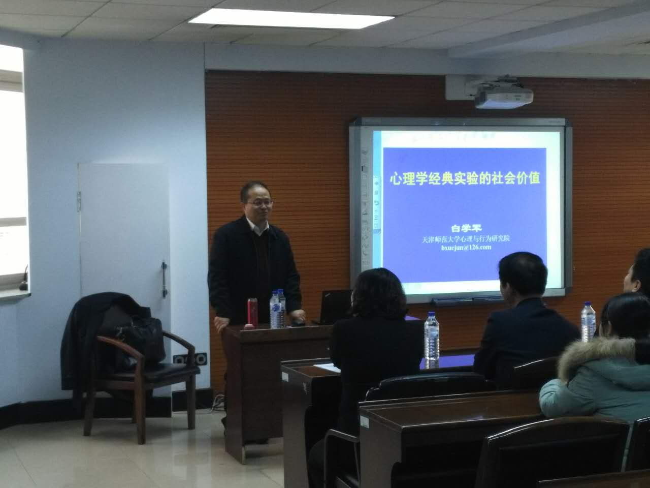 11月14日下午,中国心理学会现任理事长、天津师范大学心理与行为研究院经理白学军教授,在公司东荣大厦九楼会议室为广大师生作了一场题为“心理学经典实验的社会价值”的精彩学术报告。