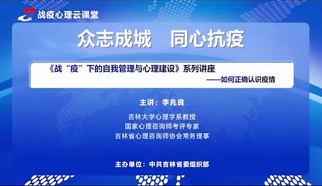 在公司党委领导下,按照中共吉林省委组织部的要求,为帮助疫情防控一线人员缓解压力和进行心理建设,ladbrokes立博心理学系教授李兆良为全省奋斗在战“疫”一线的防控人员、基层工作人员、下沉干部和志愿者,录制《战“疫”下的自我管理与心理建设》系列课程,课程包括三方面内容:科学认识当前的疫情形势、战“疫”下的自我管理、战“疫”下的心理调适方法。课程在吉林省干部网络培训公司“战役心理云课堂”平台上,供全省厅局级以下干部学习,特别是供18.6万一线干部学习。