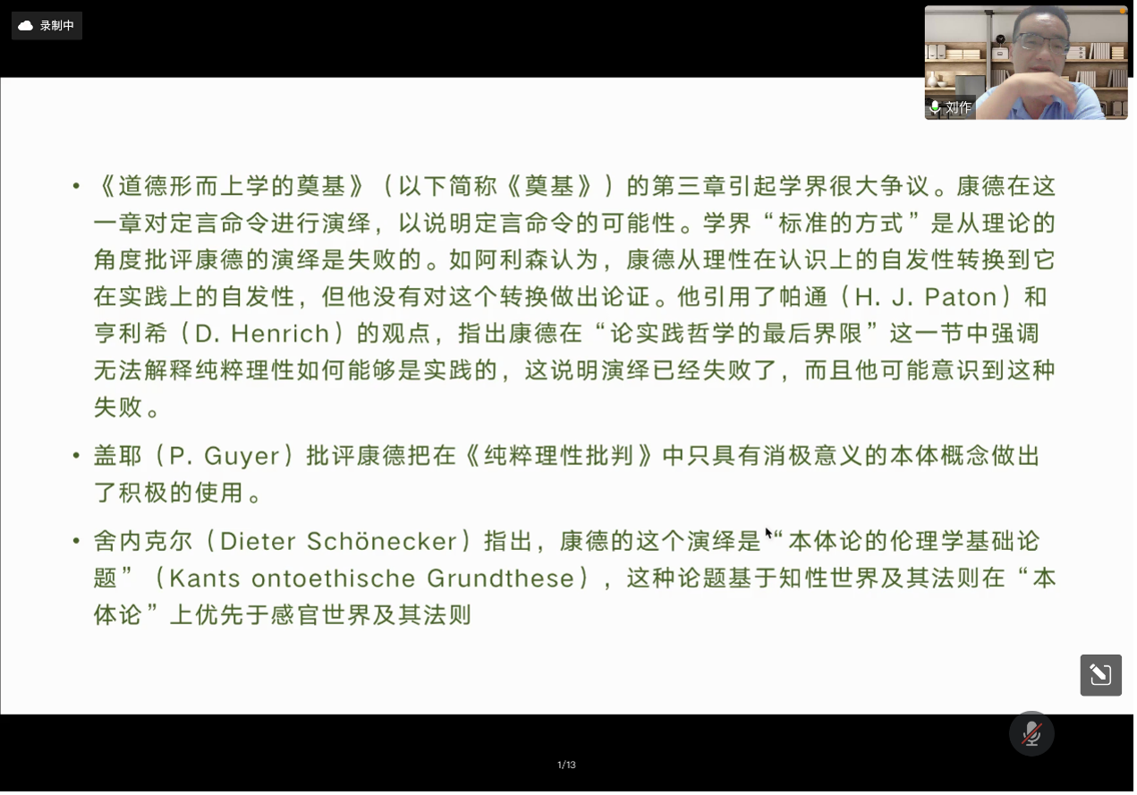 2022年04月13日19时,公司“2022年ladbrokes立博学术教育提升工程”系列讲座的第二讲依托“腾讯会议”线上平台开展。本期讲座的主题为“如何进入哲学家的文本中的概念世界——以康德《道德形而上学的奠基》定言命令演绎为例”,主讲人为中山大学哲学系刘作副教授,主持人为公司曲红梅教授。