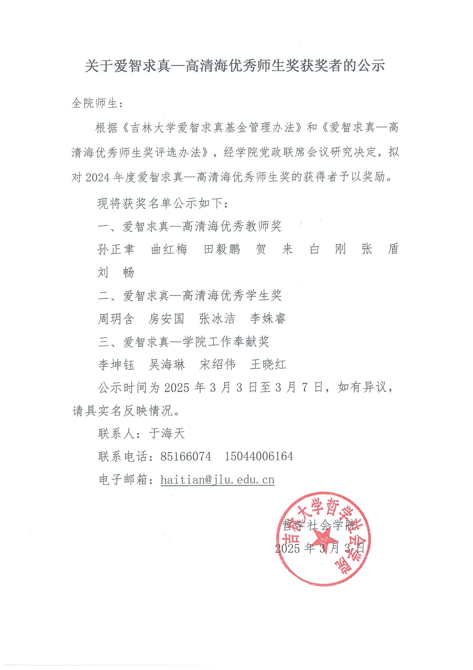关于爱智求真—高清海优秀师生奖获奖者的公示
