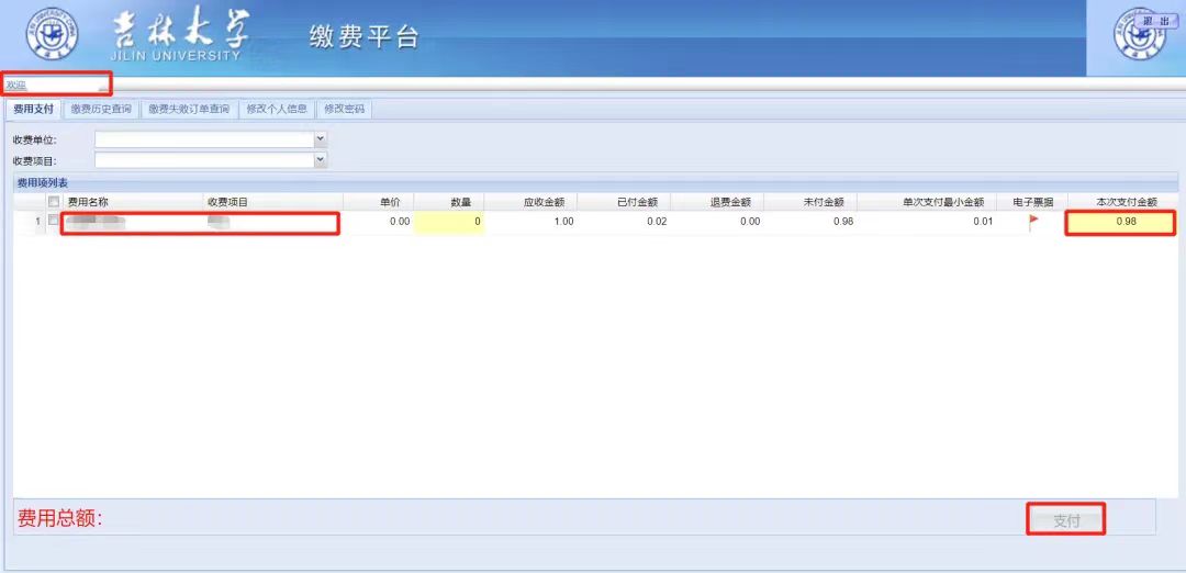 进入缴费页面,请仔细核对用户名称、缴费项目、本次支付金额,确认无误后勾选缴费项目,点击“支付”。