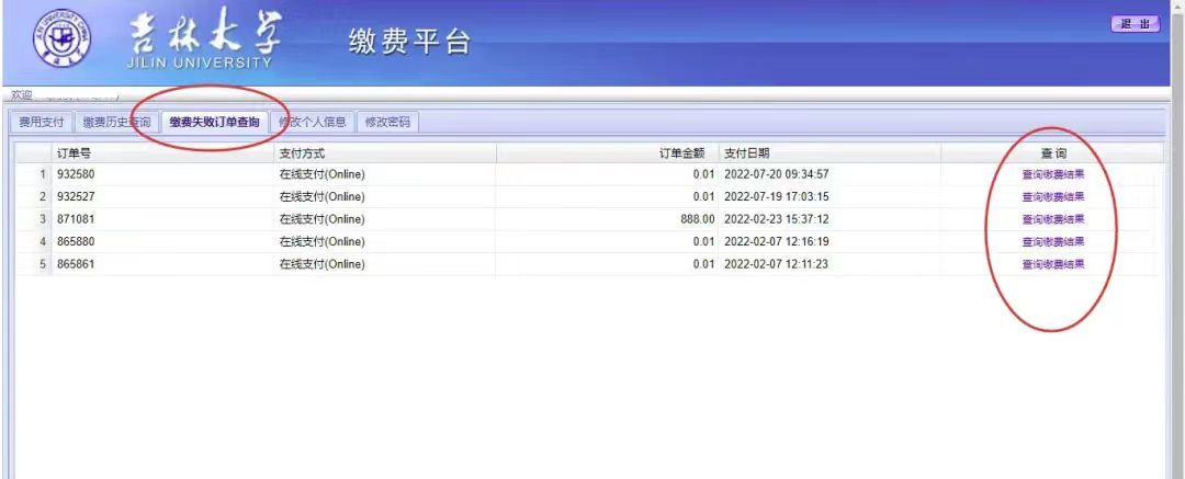 点击“缴费失败订单查询”,在显示的失败订单栏目点击“查询缴费结果”即可向银行发起缴费结果核查,核查结果可自动更新缴费状态。