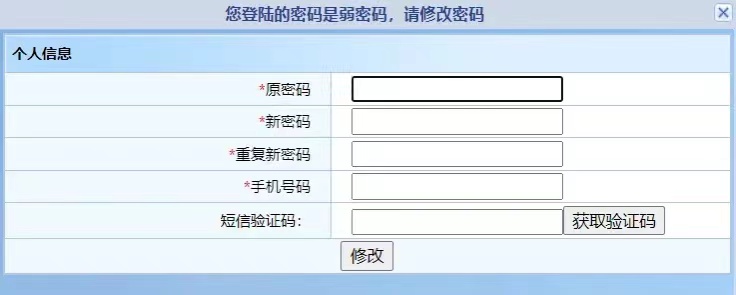 为进一步提升密码防护等级,在初次登录后,须修改密码及手机号码。