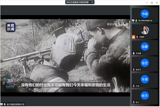 首先,各位同学共同观看抗美援朝相关视频资料。“雄赳赳,气昂昂,跨过鸭绿江”的歌声在耳畔回响,同学们的思绪仿佛伴随着军号飞翔,飞到那片白雪皑皑的大地上,体悟着先烈们“钢少气多”的坚强意志。