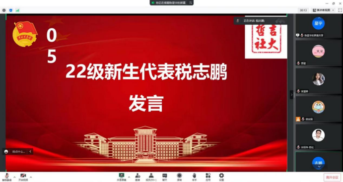 大会第五项,2022级新生代表税志鹏发言。“无穷的远方,无数的人们,都与我有关”,“既然选择了远方,便只顾风雨兼程”,他的发言引发了同学们对青春、信仰以及梦想的思考,呼吁同学们铭记历史,砥砺前行,在新时代奋力谱写青年新篇章。