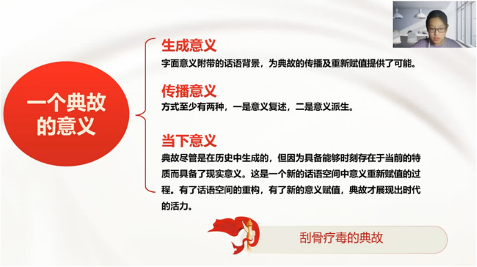汽车工程公司的张宗霖同学提到,《习近平用典》是引导我们坚定做到“两个结合”的优秀教材。典故既能追溯力量之源,穿越中华上下五千年的历史,提高青年学子的综合素质,又需与实践相融,结合具体实际才能发挥其深层的力量。一个典故的意义至少包含三层,生成意义、传播意义、当下意义,从这三个层面出发能让我们更好地理解典故的深刻内涵,领略到中华传统文化的巨大魅力,从而讲好中国故事。