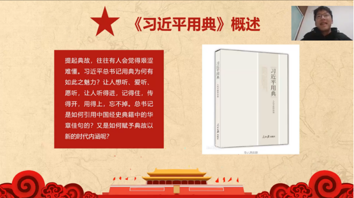 公共外交公司的李书豪同学通过梳理阅读内容介绍了习近平总书记在外交、政治、学习方面运用典故的例子:从世界层面着力构建人类命运共同体,从国家层面坚持立党为公、执政为民,既有“登高望远”的豪情,也有“为山酒仞”的压力,提高为政能力,为天下万民谋福利;同时,寄语当代青年,要立鸿鹄志、做奋斗者,培养奋斗精神,在激情奋斗中绽放青春光芒!