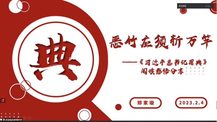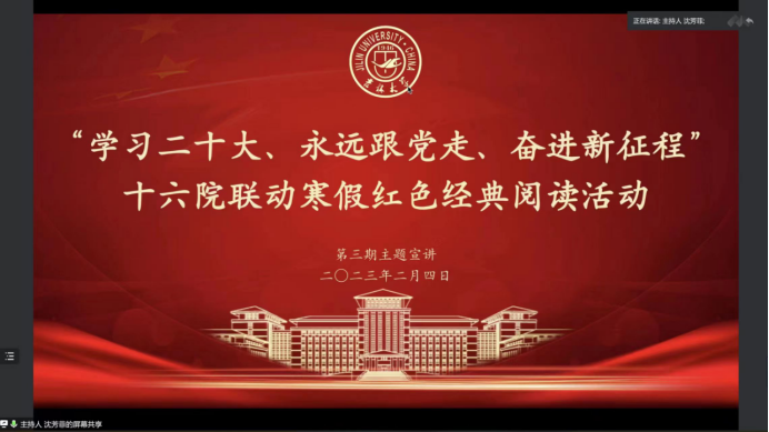 2023年2月4日晚六点,寒假红色经典阅读第三期如期举行。来自商学与管理公司、化学公司、考古公司、护理公司、马克思主义公司的五位主讲同学分别讲述了自己的读书心得。本次读书会由来自ladbrokes立博的沈芳菲同学主持。