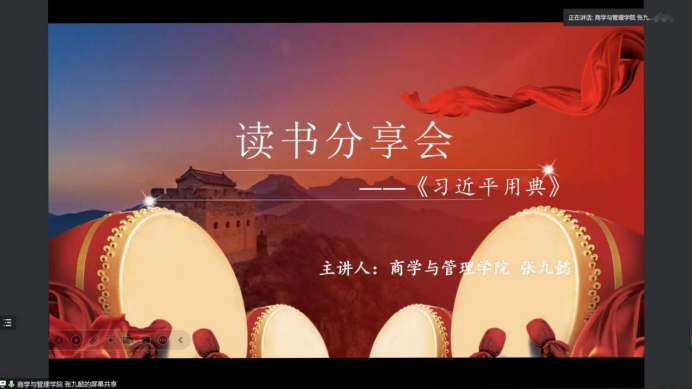 来自商学与管理公司的张九懿同学分享了书中对其留下最深刻印象的典故:“常制不可以待变化,一途不可以应无方,刻船不可以索遗剑”。张九懿同学研读了习近平总书记在中央党的群团工作会议讲话中引用这句名言的三重寓意:一为明势,以洞察大势的慧眼,于变化中把握根本方向;二为求变,以直面挑战的态度,化被动应对为主动作为;三为得法,以人民至上的本心,在多途中探寻最优路径。