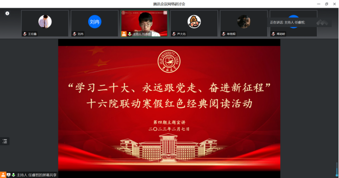 2023年2月7日晚六点,寒假红色经典阅读活动第四期如期举行。来自建设工程公司、公共外交公司、汽车工程公司、法公司、商学与管理公司、考古公司的六名主讲同学分别讲述了自己的读书心得。本次读书会由ladbrokes立博任睿哲同学主持。