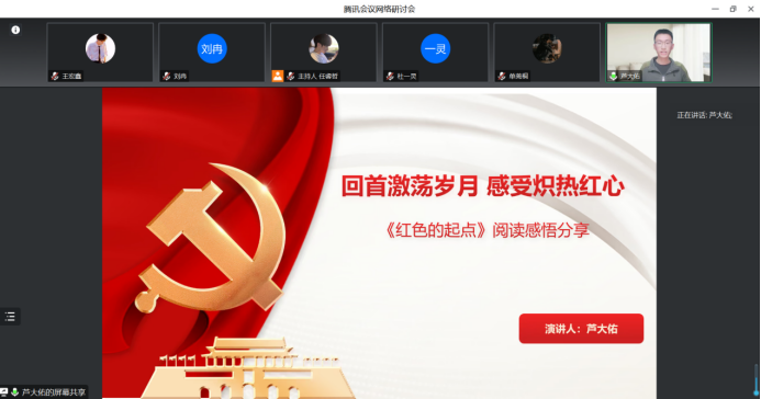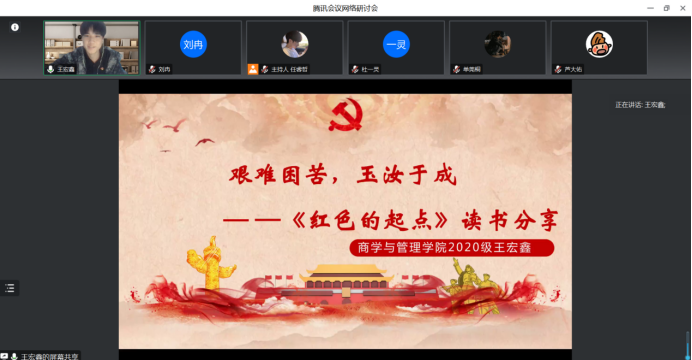 商学与管理公司的王宏鑫同学从“永怀希望,积极向前”“不忘初心,方得始终”“艰难困苦,玉汝于成”三个方面分享了他的读书感悟。他带领大家回顾了建档百年的无数个重要的瞬间,从南湖的红船到南昌的枪响,从井冈山的星星之火到两万五千里长征,从一穷二白到自立自强,党的奋斗历史激励着大家坚定为中华民族伟大复兴而不懈奋斗。