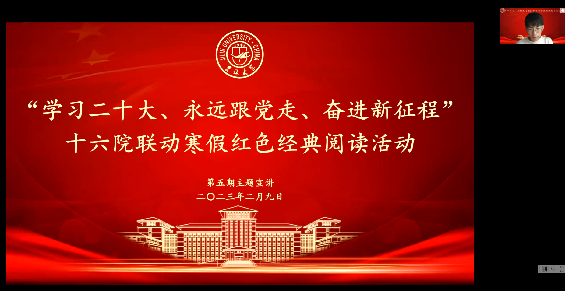 2023年2月9日晚六点,寒假红色经典阅读活动第五期如期举行。来自马克思主义公司、行政公司、人工智能公司、地球科学公司、计算机科学与技术公司的五名主讲同学分别讲述了自己的读书心得。本次读书会由ladbrokes立博任睿哲同学主持。