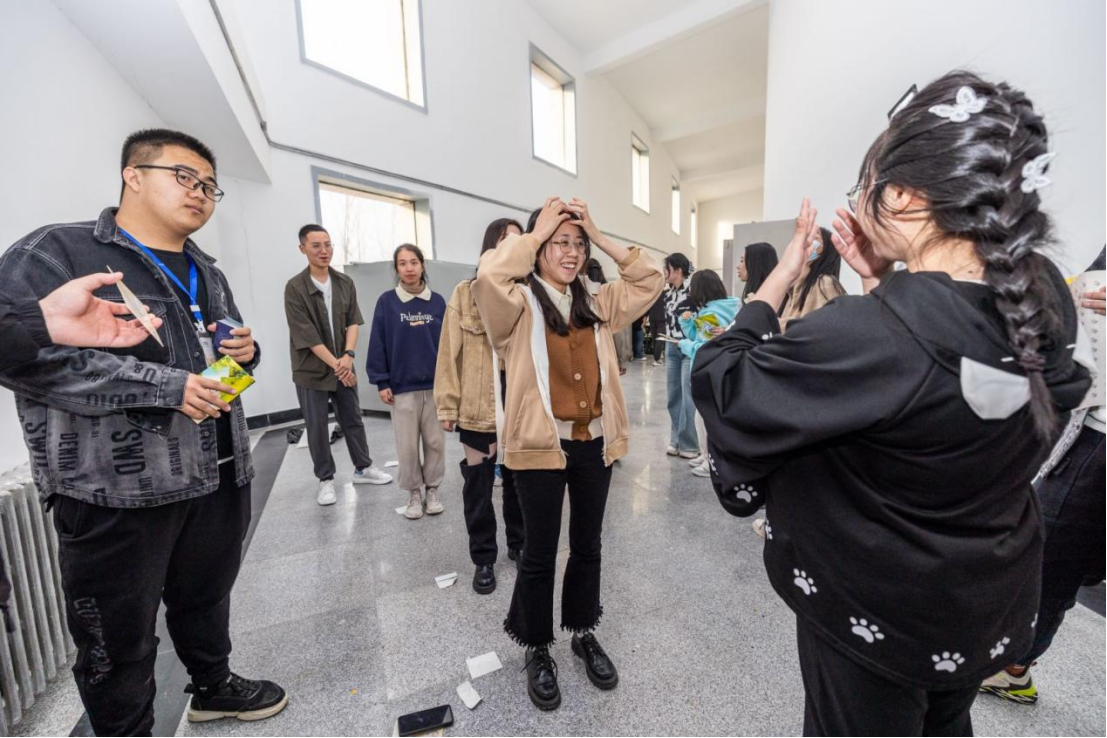 这也许是人生中距离K-POP最近的一次?辅导员宋绍伟老师和来自2020级的王梓铭、曾辞源两位同学共同跳起了“三哈”舞,可爱的舞姿和律动的音乐再次将全场的氛围烘托到高潮。台下的观众纷纷举起手机,留下这宝贵的精彩瞬间,笑容在台下每位观众的脸上停留。