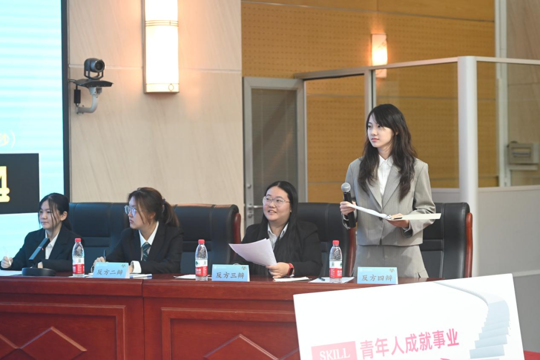 决赛中,双方辩手紧紧围绕“青年人成就事业广阔舞台/自身能力更重要”这一辩题展开了深入辩论。成就一番壮丽的事业,青年人是要等待广阔舞台再款款上场,还是努力提升自身能力以拼搏获取事业成功的一线曙光?正反双方根据各自的立论,引经据典,各抒己见。你来我往之间,针锋相对,弘扬道理,不断迸发出语言的智慧与思想的火花。面对双方辩手金句频出、妙语连珠,全场观众掌声连连,全场氛围热烈浓厚。