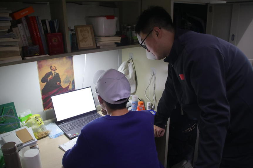 针对同学们寝室中存在的卫生问题,刘畅老师向同学们提出清理建议,提醒大家,整洁卫生的居住环境既有助于同学们的身体健康,也有助于心情愉悦,促进学习生活的进步;针对已经考完全部考试的高年级同学,刘老师亲切咨询了员工返乡时间以及假期规划。