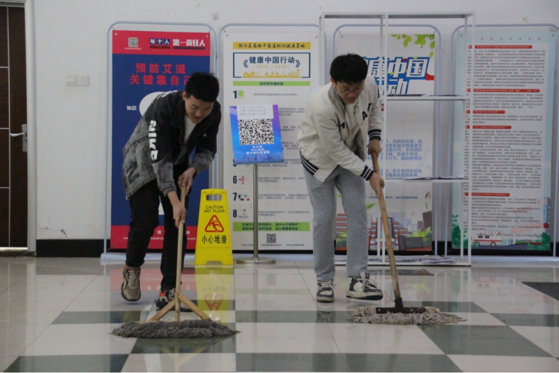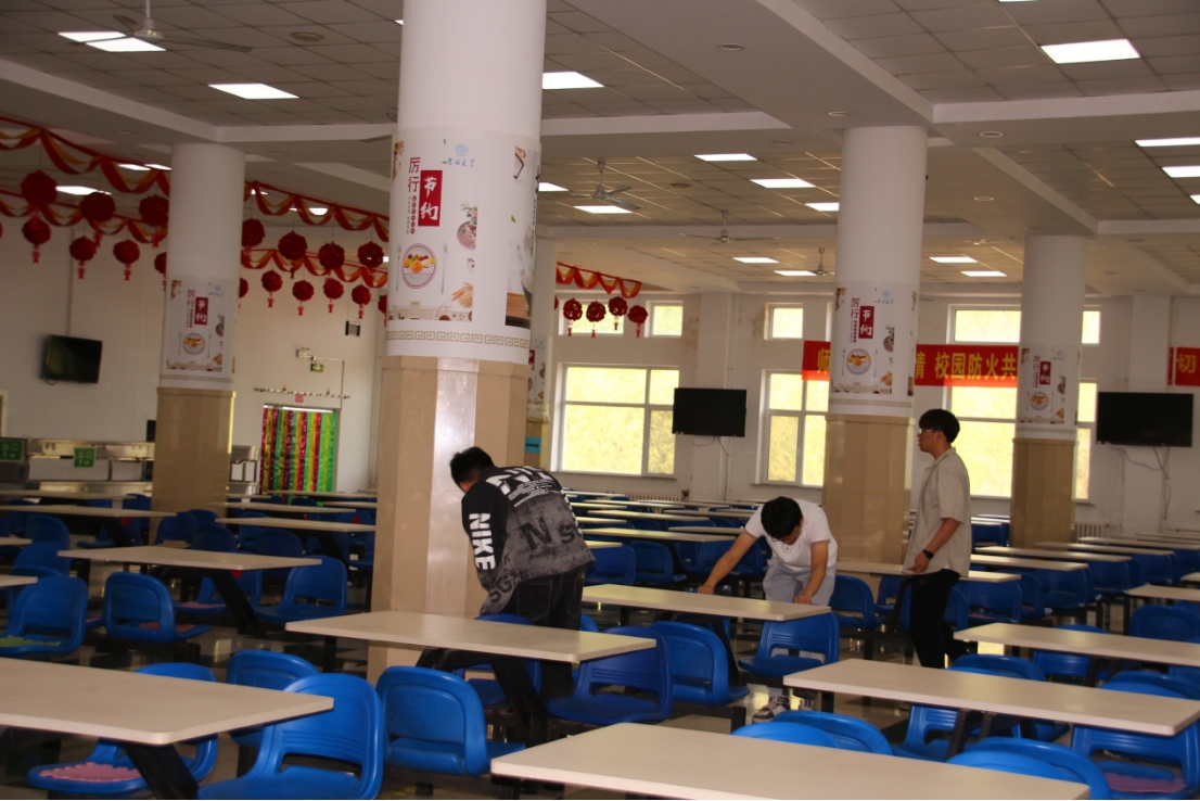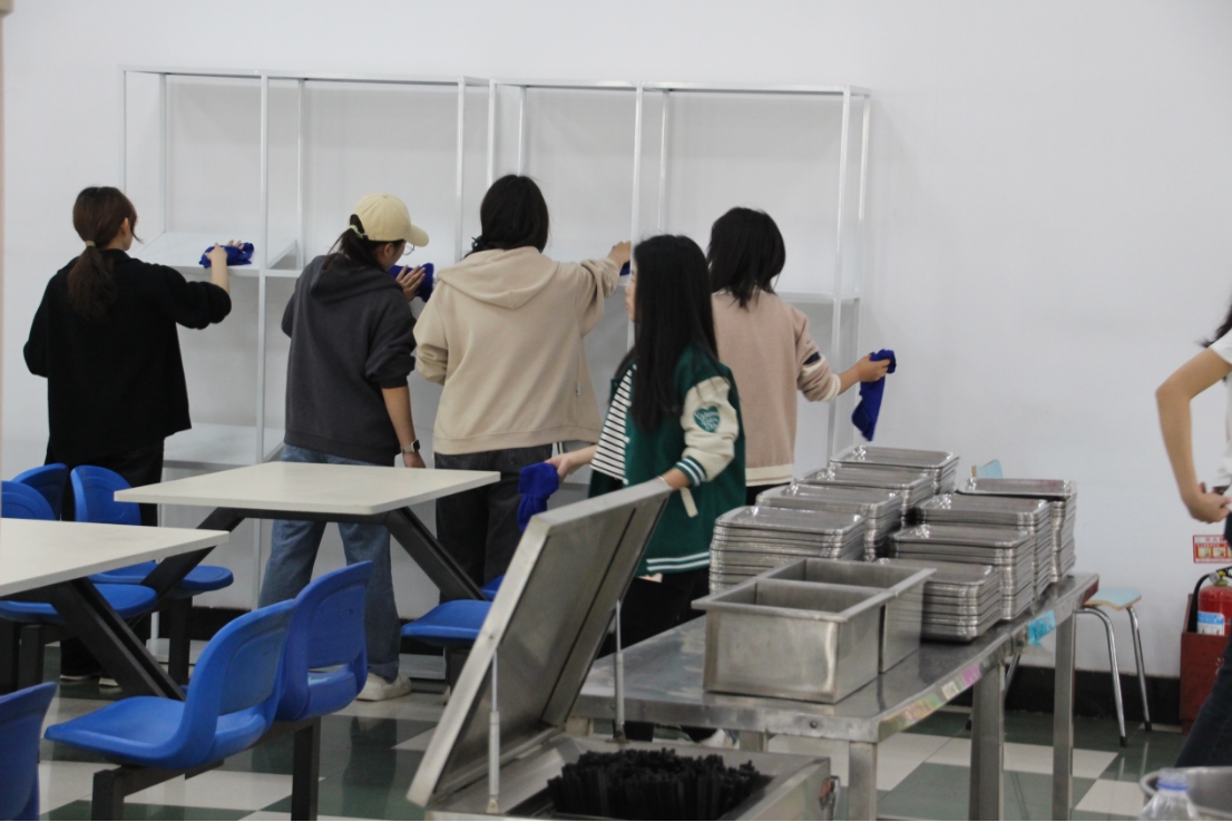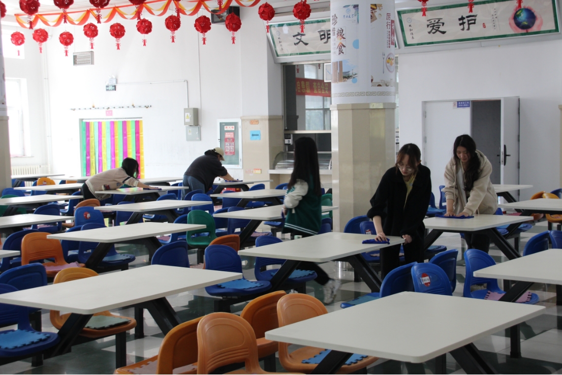 在活动负责人的带领下,同学们分工明确,有序进行卫生清扫同学们手持工具,仔细清理纸屑垃圾耐心擦拭灰尘污渍同时对用餐桌椅进行整齐排列,并在座椅上摆放好干净的坐垫。