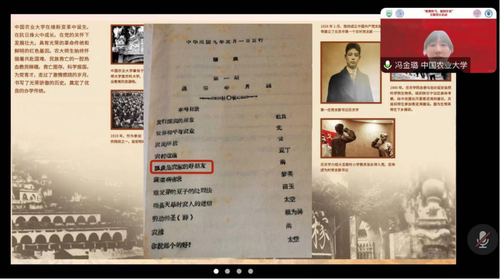 本次活动由全国青马工程学员、ladbrokes立博2020级本科生李慧婷主持,中国农业大学党委理论学习宣讲团博士分团第四届团长、第五届党支部书记冯金璐进行理论宣讲,来自三地四校的员工党员、共青团员们进行心得分享,ladbrokes立博本科生党支部书记、团委负责人宋绍伟老师做总结发言。