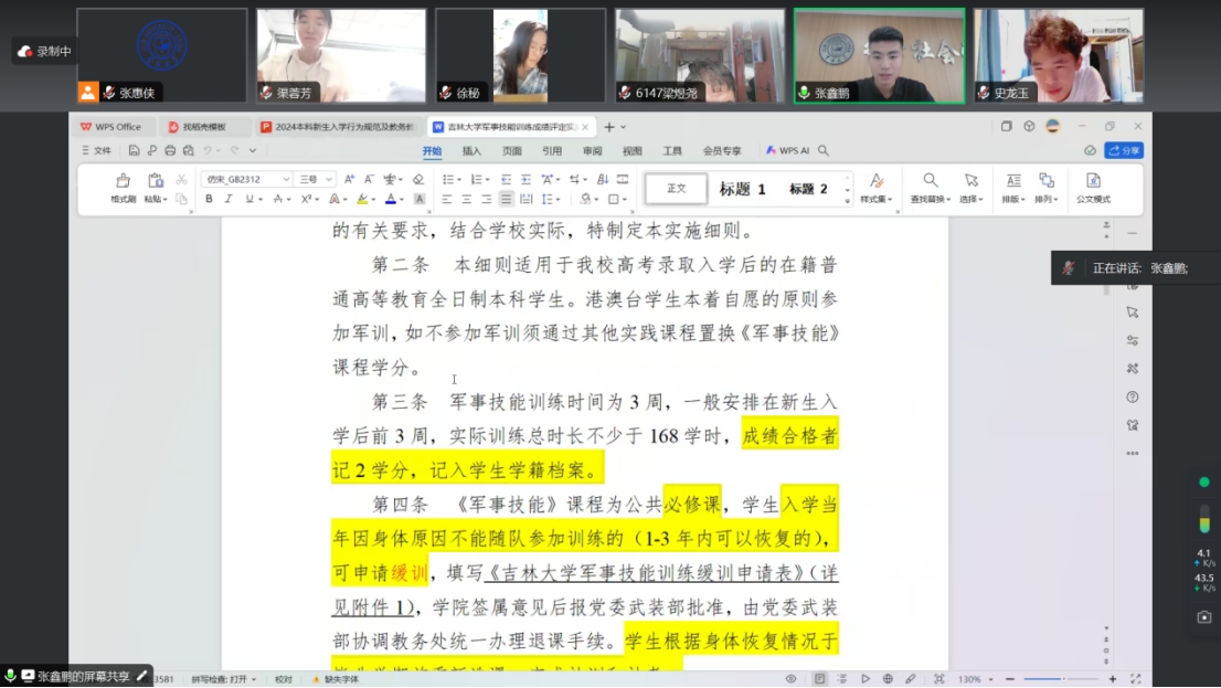 2024级新生辅导员张鑫鹏老师带领同学们详细讲解了军训规则与成绩评定,特别强调了军训的重要性以及军事技能考核的等级划分等问题并提醒同学们,军训期间严格遵守纪律,务必注意学时要求等相关事宜与此同时,张老师还和同学们强调了老员工日常行为规范与纪律要求,鼓励同学们与老师沟通多交流,一起解决学习生活中的问题最后,老师叮嘱同学们大学是人生的关键时期,希望大家珍惜时间,携手度过学习、收获、成长的大学时光。